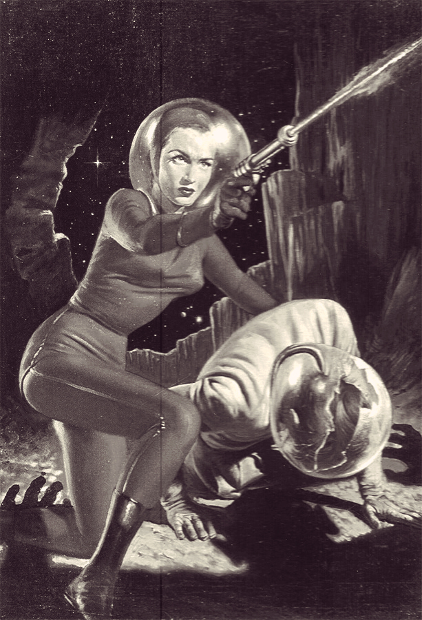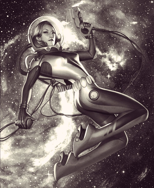 The setting is based on retro pulp SF from the 40’s and 50’s. Sleek rocket ships with giant fins, space suits with bubble helmets, ray guns, giant computers that take up the entire room, programming done on punch cards or patch cables are the core aesthetic.