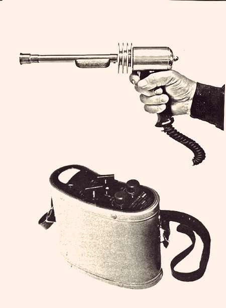 Ray guns are the most commonly used type of fire-arms. The gun itself is a small pistol, which is useless without the large battery pack to which it is attached by a coiled cable. The battery pack usually comes with a shoulder strap, and worn at the hip. Some space suits come with a dedicated mount for the battery pack.